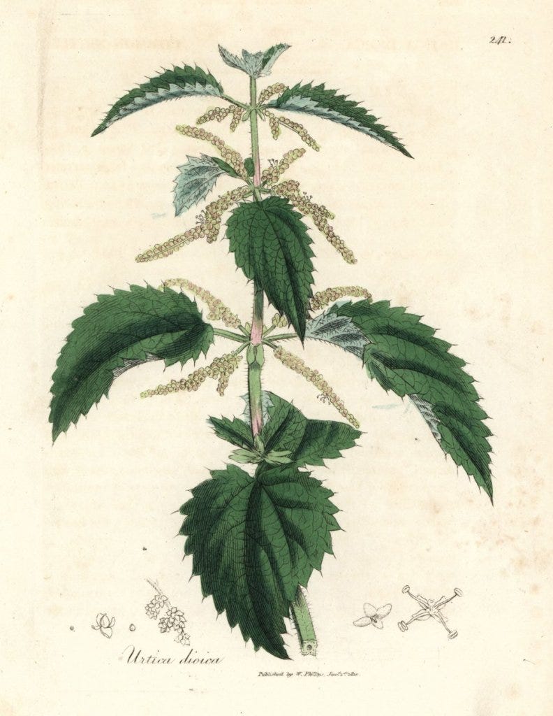Nettle was thought to be one of the main staple foods that kept many people from starving during the famines in both Ireland and Scotland. It was said that after the massacres of the “…aged and infirm, the nursing mother and the baby at the breast, the blind and feeble men, women, boys and girls, sick persons and idiots’ countless more died of starvation as the policy by Englishmen was to take or destroy all food deliberately and the Irish people were then commonly found in ditches ‘with their mouths all coloured green by eating nettles, docks and all things they could rend above ground.”9 Caesar’s troops likely introduced the Roman nettle (U. pilulifera) into Britain and they often flailed themselves with nettles to keep warm. This practice was a common folk remedy known as ‘urtication’, and essentially entailed beating oneself with nettles and bringing blood to the surface for a warming effect that eased symptoms of arthritis and rheumatism.
